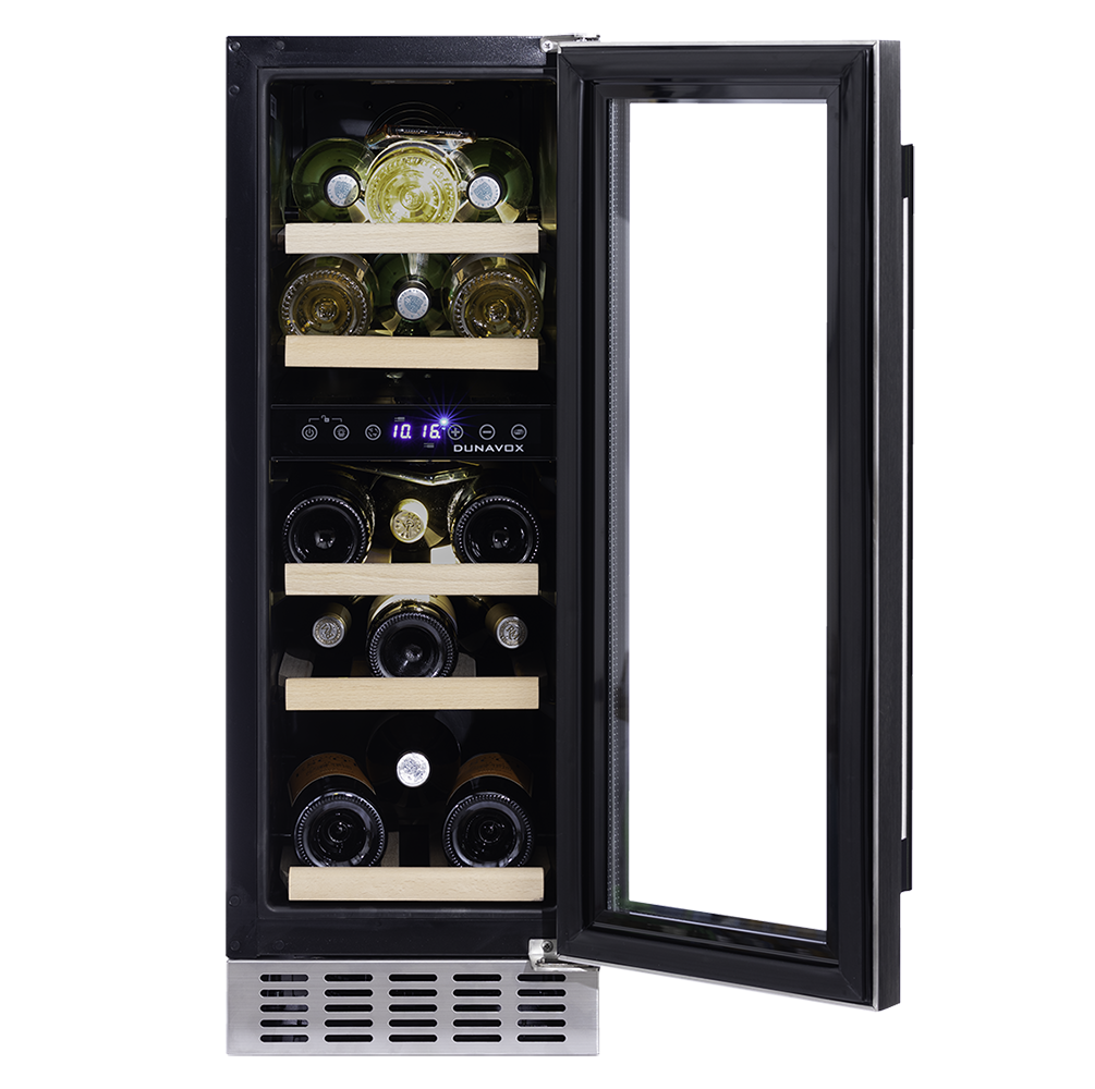 Model DUNAVOX Flow-17 pasuje idealnie do nowoczesnej kuchni. Butelki spoczywają na solidnych drewnianych półkach w oszałamiającym, jasnobiałym wnętrzu. Należy zwrócić uwagę, że model ten jest przeznaczony do zabudowy podblatowej.
