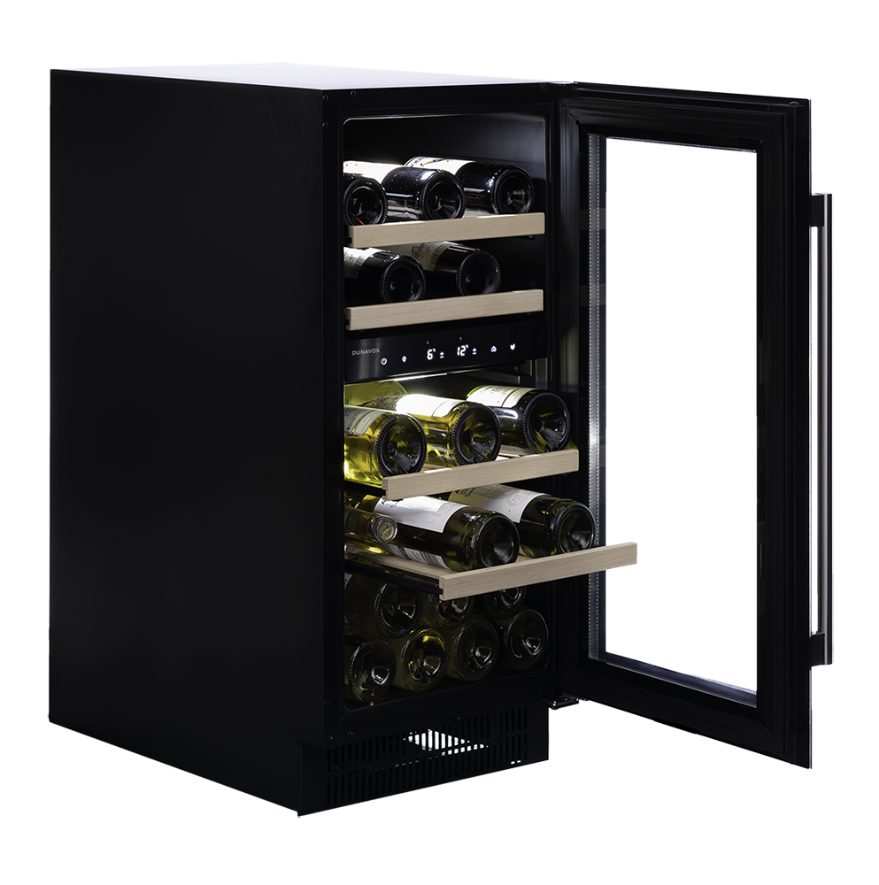 Butelki są umieszczone na solidnych drewnianych półkach i oświetlone białym, bursztynowym i niebieskim oświetleniem wewnętrznym LED. Temperatura w dolnej strefie musi być niższa niż w górnej. Należy zwrócić uwagę, że model ten jest przeznaczony do zabudowy podblatowej.