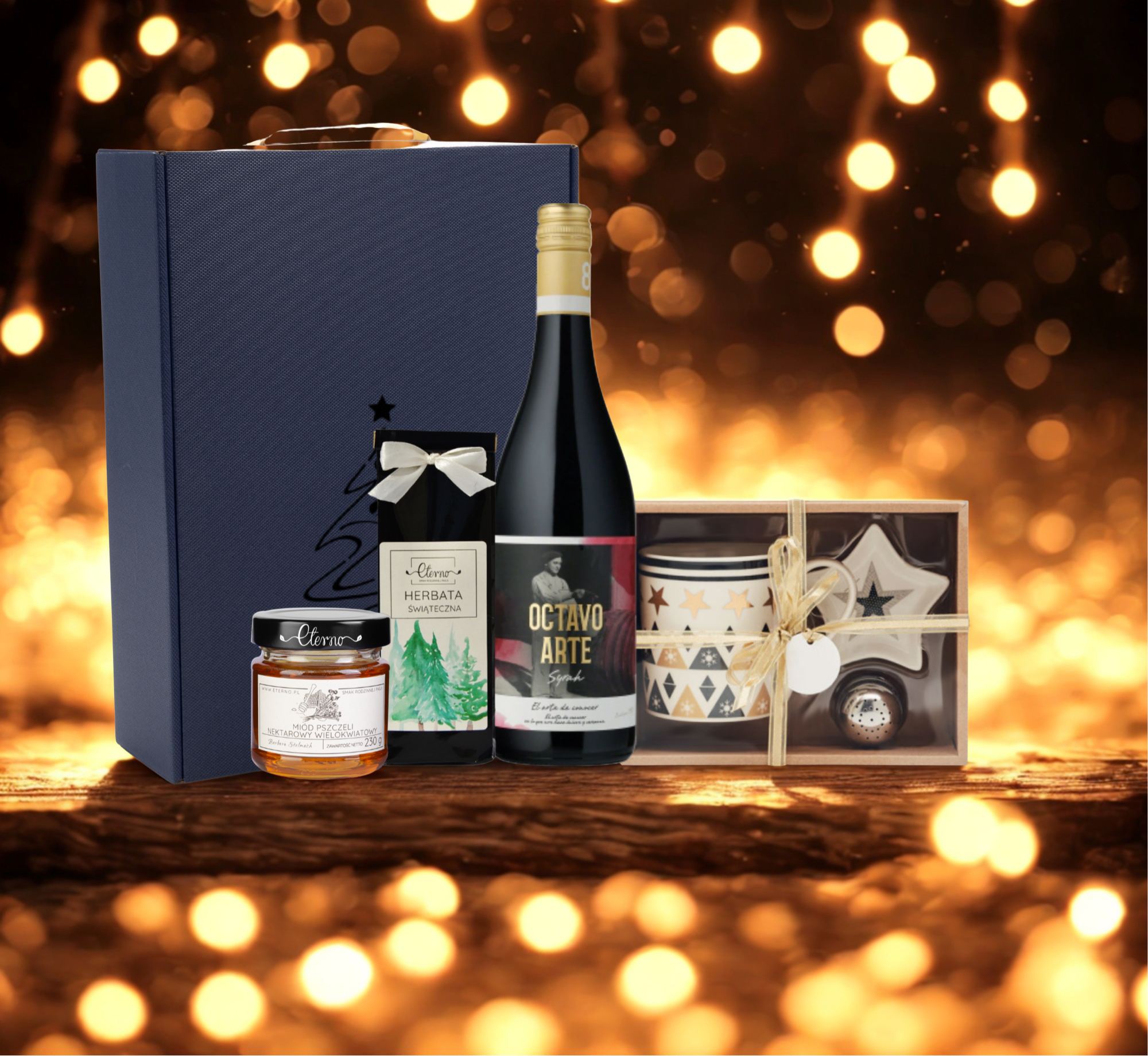 • Świąteczny zestaw zawierający ceramiczny kubek, zaparzacz oraz mini talerzyk